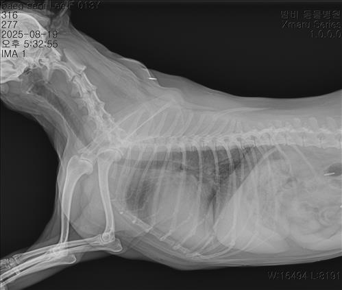 안녕하세요 용인 닥터펫동물의료센터입니다. 폐 부위에서 전반적으로 뿌옇게 보이는 부분이 일부 보이는데, 이는 심장비대로 인한 폐혈관 울혈일 수 있고, 폐수종이 차기 시작하는 초기 소견일 수 있습니다. 심장병 C단계로 단정하려면 폐 실질에 뚜렷한 물 번짐 패턴이 보이거나, 기침/호흡곤란/호흡수 증가같은 증상이 동반됩니다. 지금은 B2단계지만 폐울혈이 의심되는 경계 상태일 가능성이 있습니다. 더 정확히 하시려면 심장초음파 검사를 하는 것을 권해드립니다.