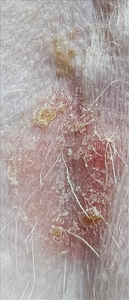 사진으로 보았을 때 배 중앙에 각질, 딱지, 붉은 피부가 보이고 국소적으로 한 부위에만 집중되어 있는 걸로 보입니다.