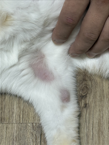 사진상으로 확인했을 때 오버그루밍으로 인한 습진일 가능성도 일부 있으나 링웜 가능성이 높아 보입니다. 탈모 모양이 경계가 뚜렷하고 약간 타원형인 점, 털이 끊어진 흔적이 보이는 점, 인접 부위 2개 이상 병변 등으로 봤을 때 탈모보다는 링웜에 조금 더 가깝습니다.